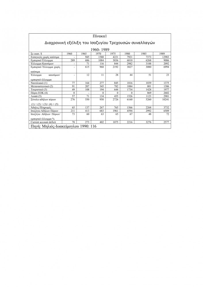 Αυτή η στρατηγική παρουσιάζεται στον πίνακα 1 του παραρτήματος. Το τουριστικό συνάλλαγμα, τα έσοδα από τον εφοπλισμό και οι πόροι από την ΕΟΚ συντελούν αποφασιστικά στη μείωση του εμπορικού ελλείμματος. Διαφορετικά ειπωμένο το σχετικά αδύνατο σημείο του ελληνικού καπιταλισμού που ήταν η ανταγωνιστικότητα της βιομηχανίας του, το αντιστάθμιζε το γεγονός της πολύ ισχυρής ναυτιλιακής παρουσίας, της ανάπτυξης της τουριστικής βιομηχανίας και των πόρων από την ΕΟΚ/ΕΕ που σε σημαντικό βαθμό κατευθύνονταν στο κατασκευαστικό κεφάλαιο.